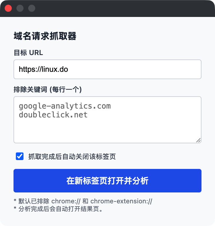 - 自定义排除:支持输入关键词(如 google-analytics)来过滤不需要的域名
