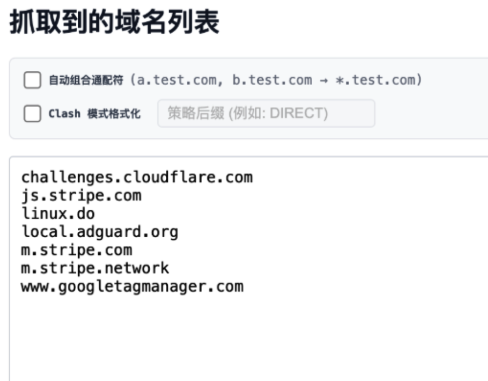 - Clash 模式:一键生成 Clash 规则格式(支持 DOMAIN 和 DOMAIN-SUFFIX),并可自定义策略(如 DIRECT 或 Proxy)