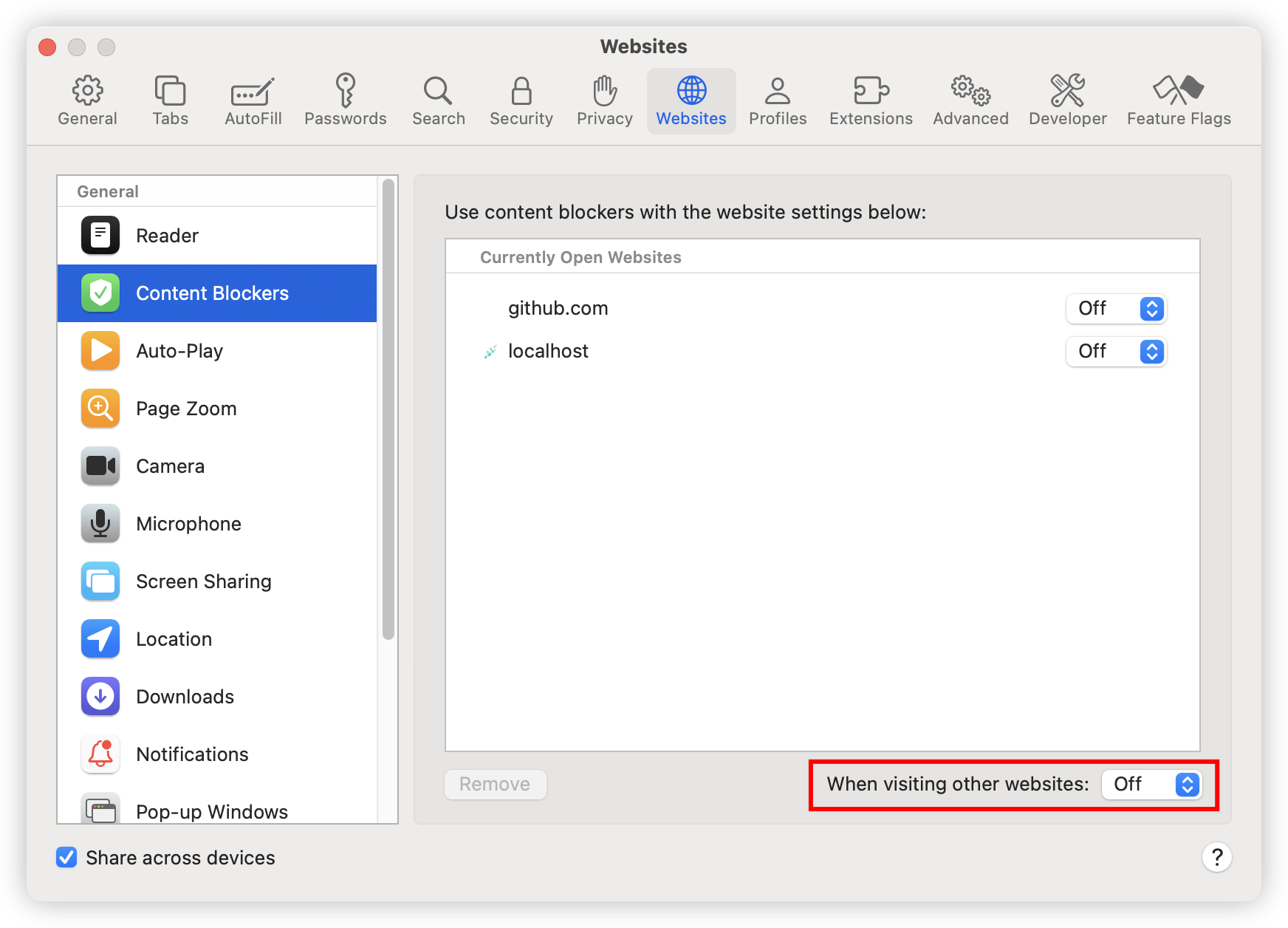在调查问题的时候发现,大部分问题的原因在于Safari浏览器自带的Content Blocker,这个功能原本是用来阻止网页跟踪器并屏蔽部分广告,但是似乎需要保存在jsdeliver上的JavaScript脚本也会被错误的拦截,可以在以下位置关闭这个选项。